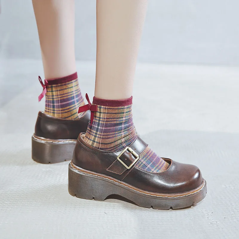 Lolita Japan Style Women Leather Shoes Harajuku Plaid Cloth Insole Cross Buckle Strap Oxfords Woman Round Toe Platform Creepers