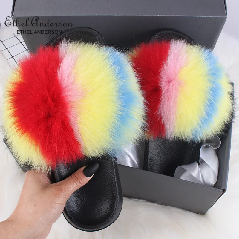 Ethel Anderson Real Fox Fur Slides Slippers Lady Natural Raccoon Flip Flops Fluffy Fur Sandals Plush Shoes Amazing Present