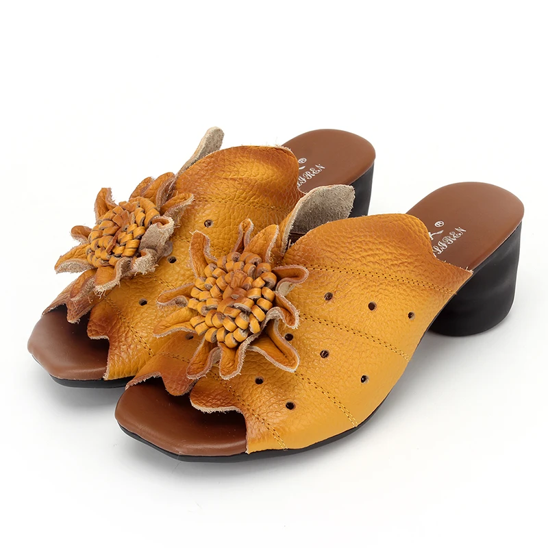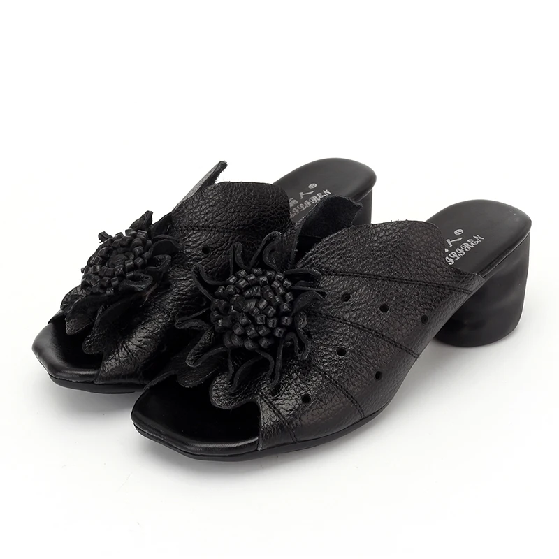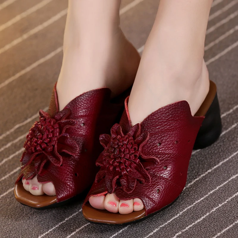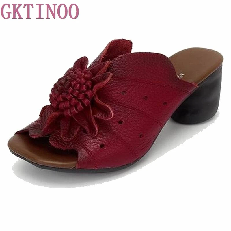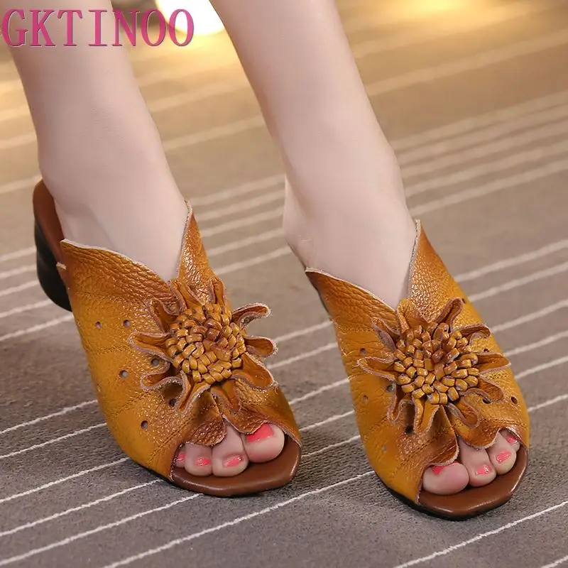 Gktinoo Flower Slippers Summer Genuine Leather Shoes Handmade Slides Peep Toes High Heels Women Slipper